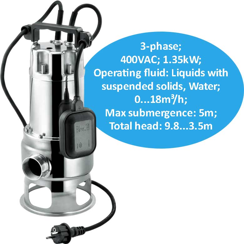 3 pha; 400VAC; Công suất (kW): 1.35kW; 1.83HP; Dùng cho chất lỏng: Nước thải (sinh hoạt, công nghiệp...); Tổng cột áp: 9.8...3.5m; Độ ngập nước tối đa của bơm: 5m; 0...18m³/h; kích thước các hạt rắn mà bơm có thể xử lý: 28mm ...Xem Thêm