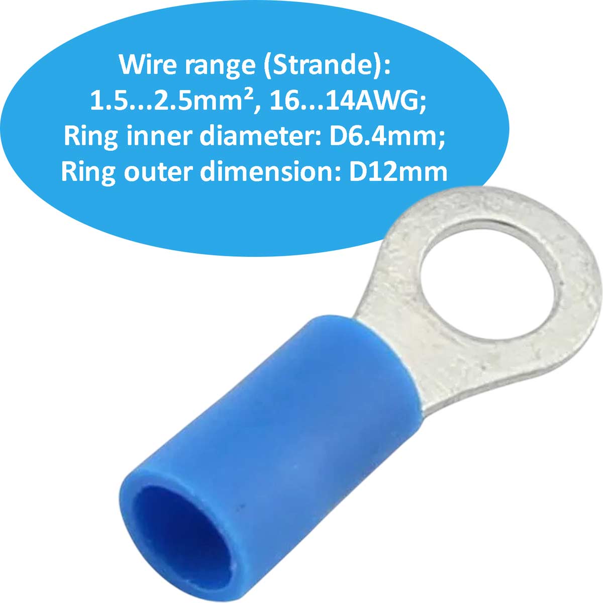 Dùng cho dây mềm: 1.5...2.5mm², 16...14AWG; Lớp cách điện: Có; Màu xanh dương; Đường kính trong của vòng bắt ốc: D6.4mm; Kích thước ngoài của vòng bắt ốc: D12mm; Đồng
