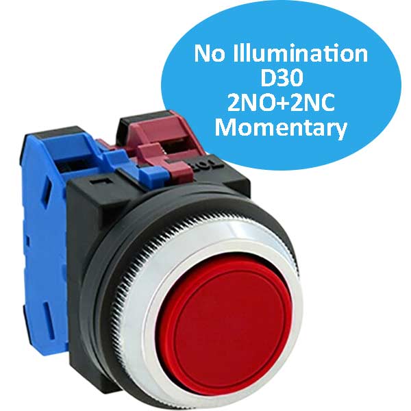 Không đèn; D30; Đỏ; 2NO+2NC; Nhấn nhả; Hình tròn bảo vệ đầy đủ (Lắp phẳng); Chất liệu vỏ: Nhựa; Chất liệu vòng bezel: Kim loại
