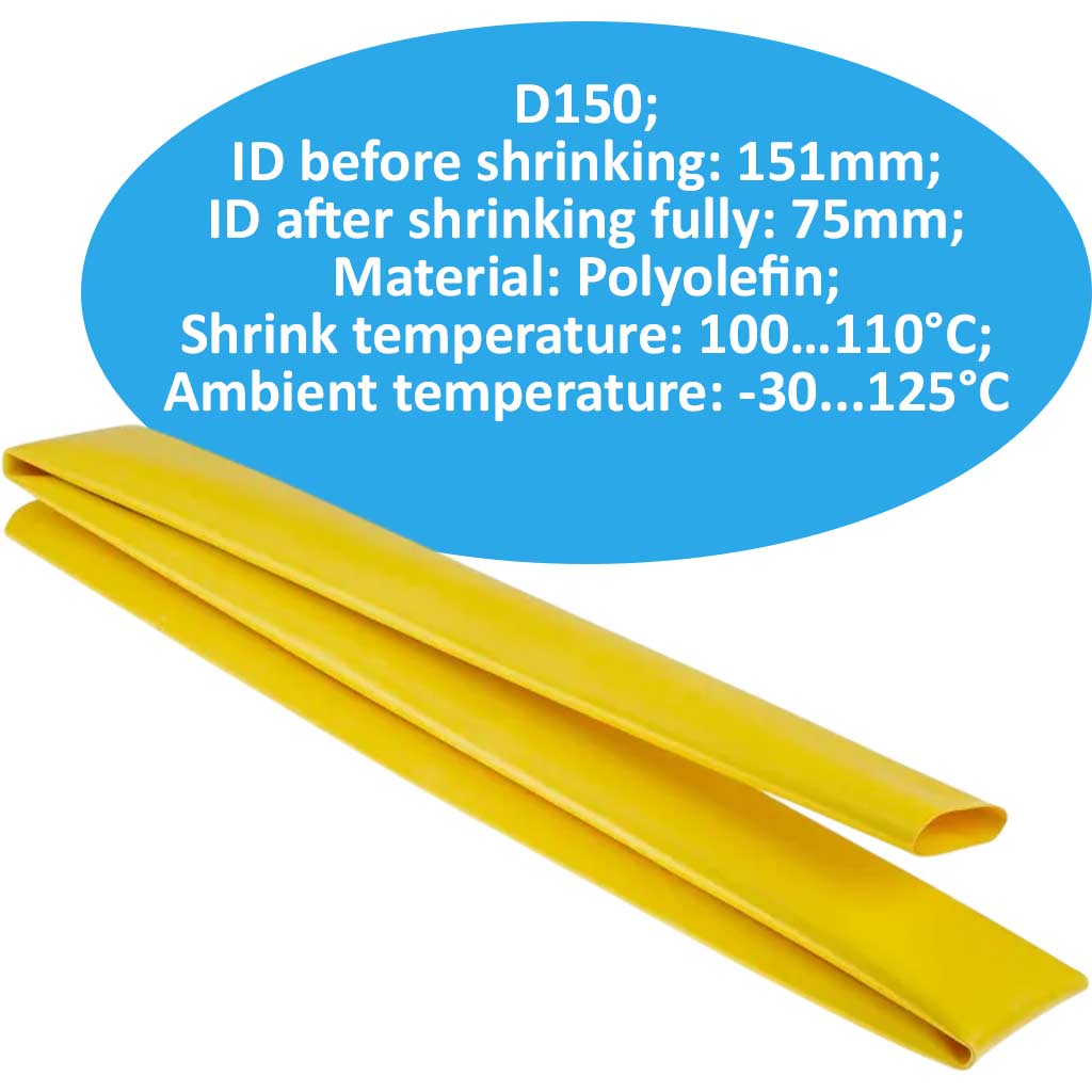 Kích thước: D150; Đường kính trong trước khi co rút: 151mm; Đường kính trong sau khi co rút hoàn toàn: 75mm; Màu sắc: Yellow; Vật liệu: Polyolefin; Nhiệt độ co: 100…110°C; Nhiệt độ môi trường: -30...125°C ...Xem Thêm