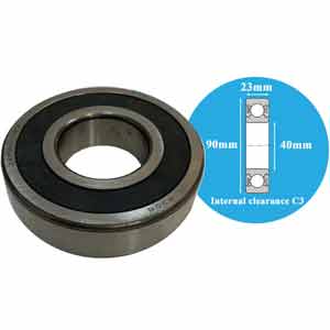 Đường kính lỗ trục: 40mm; Đường kính ngoài: 90mm; Độ dày vòng bi: 23mm; Tải trọng động: 45kN; Khoảng hở/Tải trọng ban đầu/Cấp dung sai: Khe hở C3