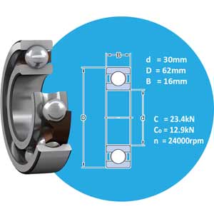 Đường kính lỗ trục: 30mm; Đường kính ngoài: 62mm; Độ dày vòng bi: 16mm; Tải trọng động: 23.4kN; Khoảng hở/Tải trọng ban đầu/Cấp dung sai: Khe hở thường