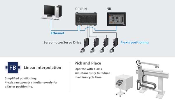 CP2E. Bộ điều khiển này có thể thu thập dữ liệu hiệu suất của máy và chia sẻ thông tin cần thiết với các mạng doanh nghiệp, trong khi dữ liệu chương trình và khối chức năng được xác định trước cho phép hầu như bất kỳ người dùng nào cũng có thể cài đặt và quản lý. Điều này làm giảm đáng kể thời gian cần thiết cho việc lập trình, kiểm tra, gỡ lỗi và bảo trì.